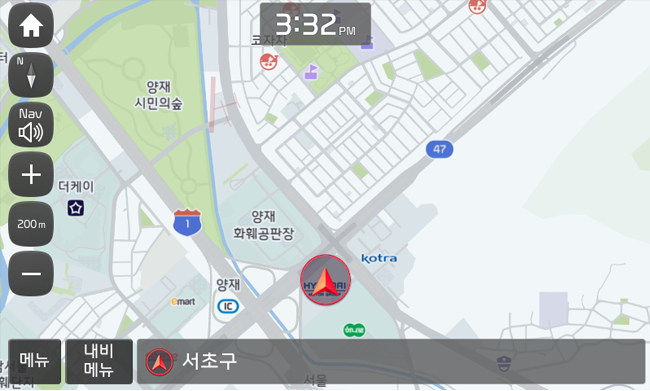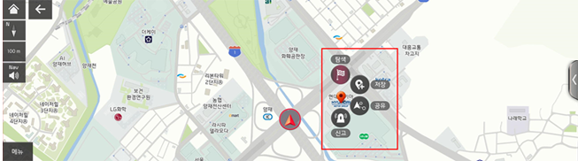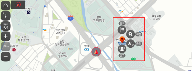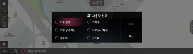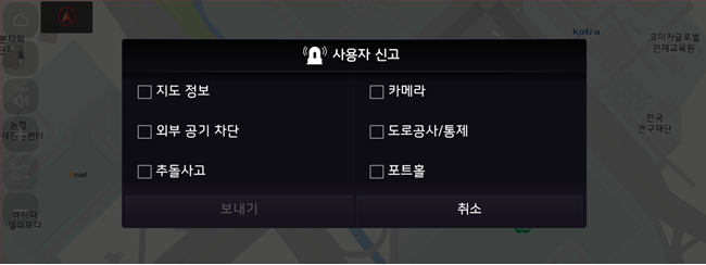 지도 정보가 이상하면 “지도 정보”, 도로 카메라 정보가 잘못되어 있으면 “카메라”, 터널 등 외부 공기를 차단해야 할 곳이 있다면 “외부 공기 차단”을 눌러주세요~ - 위치 공유로 지인에게 SMS를 전송하여 선택한 위치를 전달할 수 있어요. 장소를 말로 설명하기 어려울 때는 위치 공유를 사용해 보세요