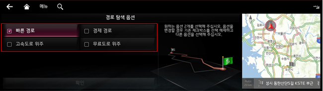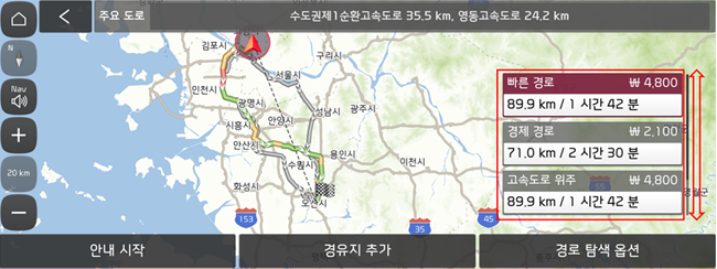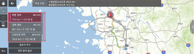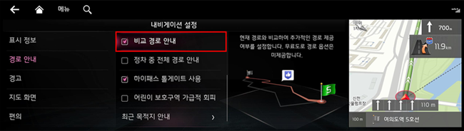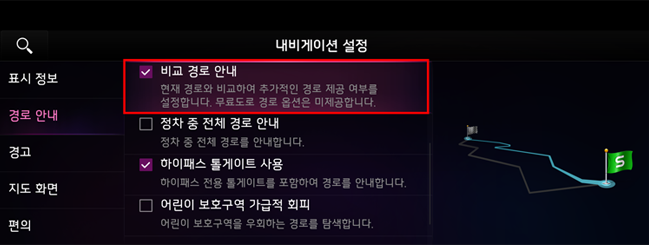 최적의 길은 저희 내비게이션이 알려드릴 테니, 교통 상황이 바뀌어도!! 막히는 길에서도!! 언제나 안심하고 운전하세요- 이 기능은 [설정] – [내비게이션] – [경로 안내] – [비교 경로 안내]에서 설정할 수 있습니다
