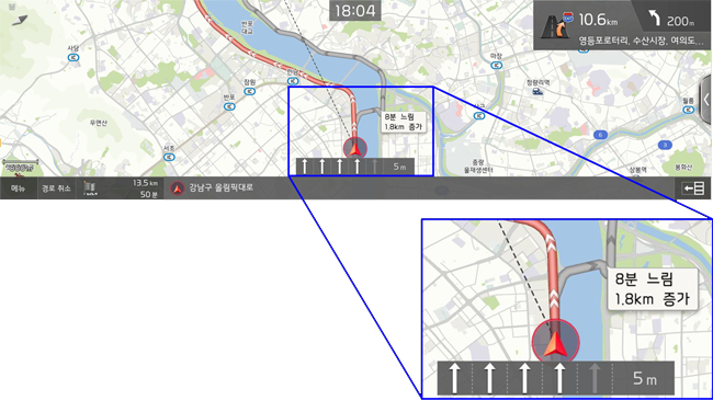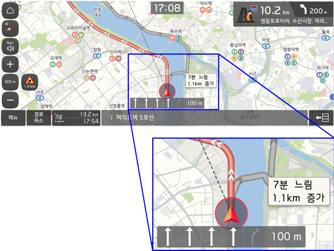 이제 경로 안내 중 길이 막히면 그 분기점에서 혹시 다른 길로 갈 때 시간과 거리가 얼마나 더 걸리는지를 딱! 계산해서 자동으로 알려준답니다.