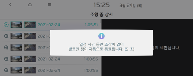 - 주행 중 일정 시간 동안 조작이 없는 경우 빌트인 캠이 자동으로 종료됩니다