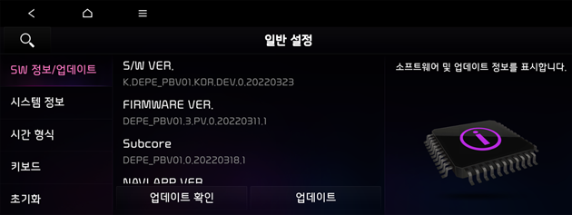 - 업데이트가 완료되면 시스템이 자동으로 꺼졌다가 다시 켜지고, SW 정보/업데이트 화면의 버전 정보가 업데이트한 버전으로 변경됩니다
