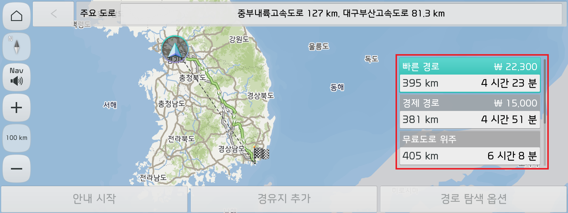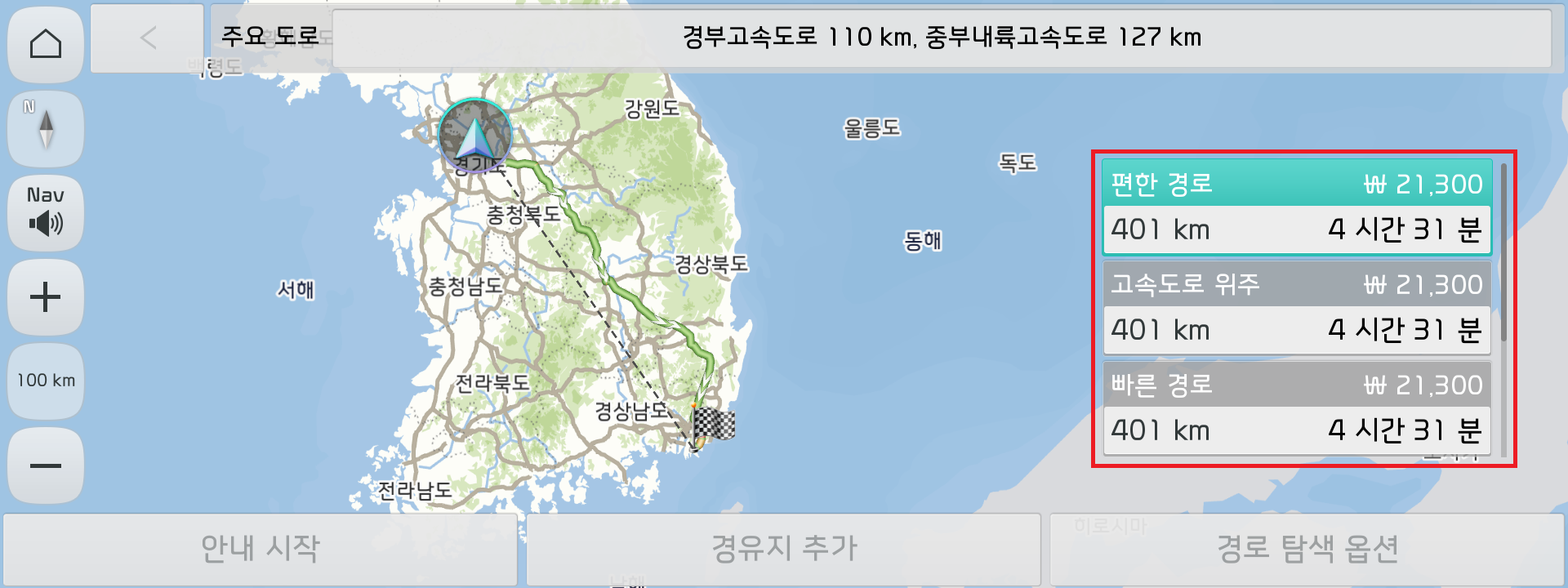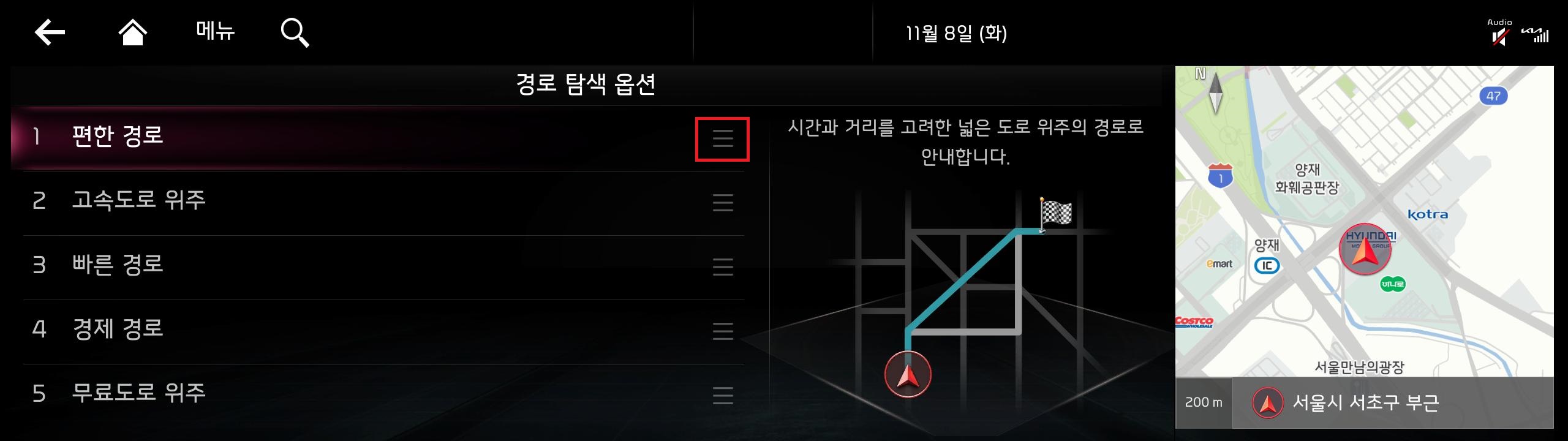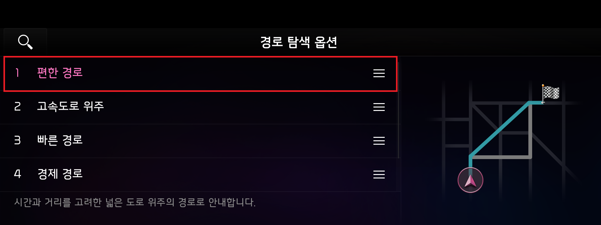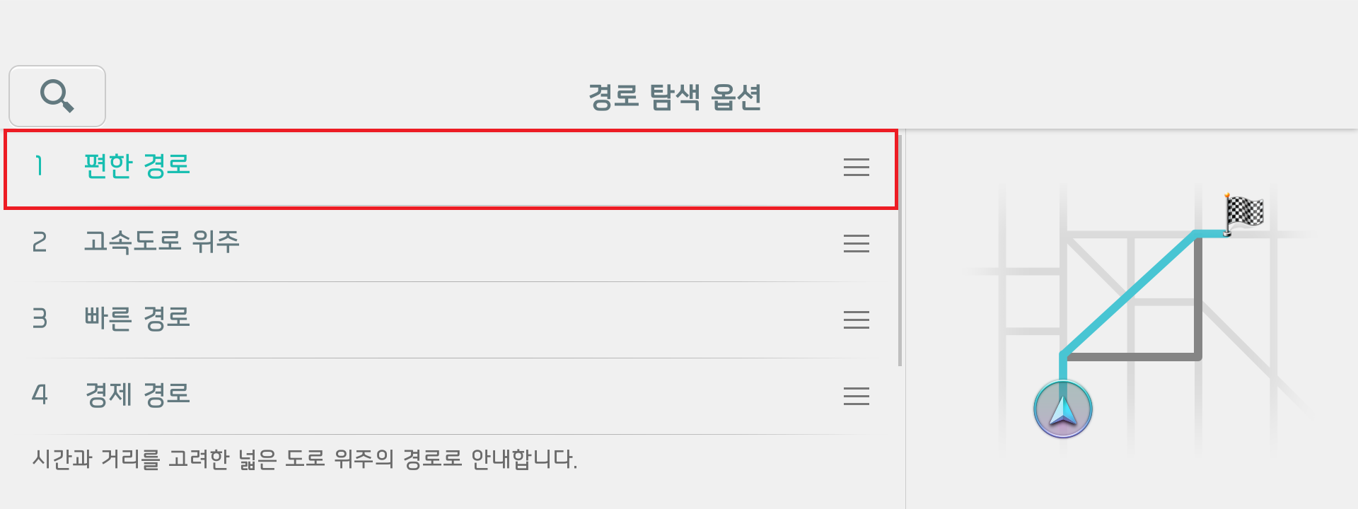 매번 모든 경로를 비교하기 불편하다면, [설정] – [내비게이션 설정] – [경로 안내] – [경로 탐색 옵션]에서 선호하는 탐색 옵션의 순서를 조정해 보세요.