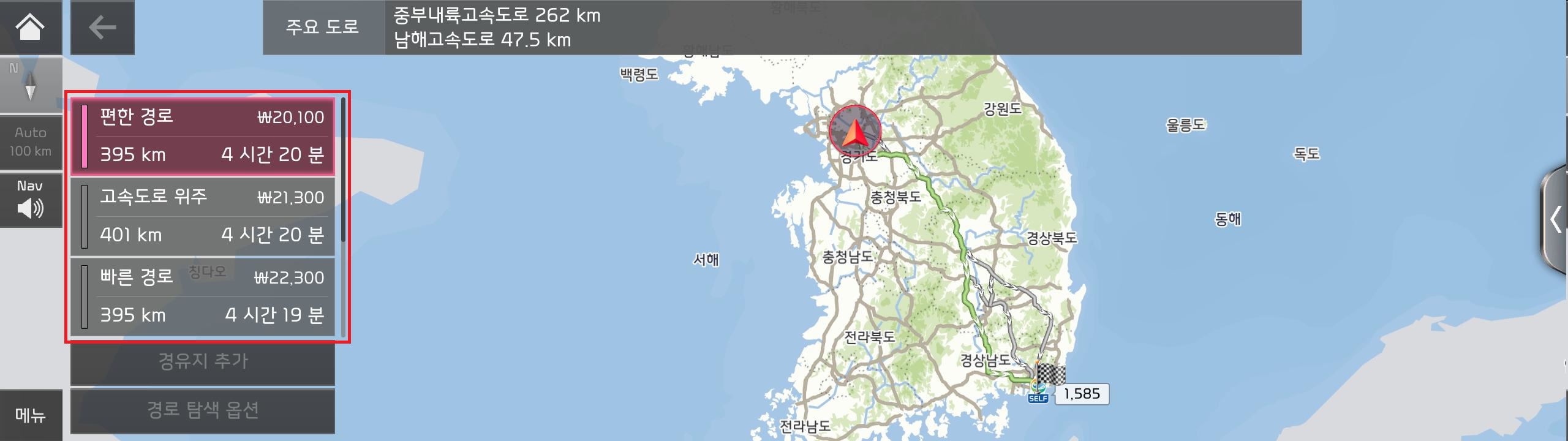 넓은 도로를 위주로 빠르게 목적지에 도착할 수 있는 ‘편한 경로’ 옵션이 신규로 추가되었습니다